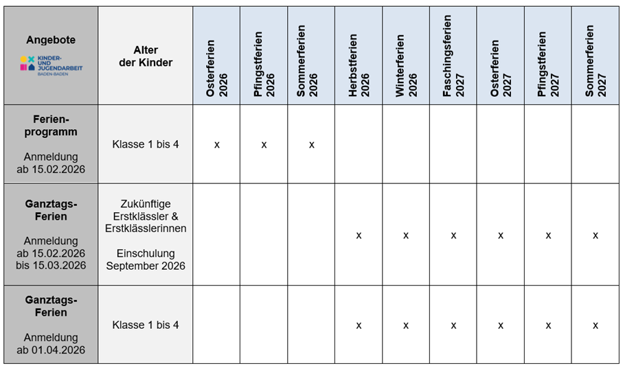 die Abteilung Kinder- und Jugendarbeit der Stadt Baden-Baden freut sich, Ihnen auch im Jahr 2026 wieder ein verlässliches Betreuungsangebot während der Schulferien anbieten zu können.